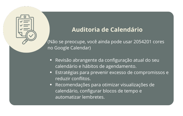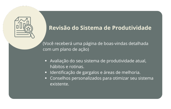 Para tirar o máximo proveito da nossa sessão, é útil ter uma ideia clara dos seus objetivos e dos desafios que está enfrentando. Se possível, tenha acesso ao seu calendário e às ferramentas que você usa atualmente para gerenciar seu tempo e tarefas.